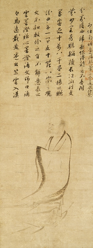 At the top of the image is an inscription by Kempo-Shidon (1285-1361), a Zen monk who was active from the Kamakura period to the Nambokucho period. Kempo-Shidon was from Hakata in Chikuzen Province and studied under Nanzan Shiunn, the 11th abbot of Tofuku-ji Temple in Kyoto, and inherited his teachings. He served as abbot of Tofuku-ji and Nanzen-ji Temples, and during the Bunwa era (1352-55), he concurrently served as abbot of Kencho-ji and Engaku-ji Temples in Kamakura, thus being active across both the five major Zen temples of Kyoto and Kamakura. The inscription includes the phrase “former abbot Nanzen,” indicating that it was written sometime between the Kannou era (1350-52), when Kenpo left Nanzen-ji Temple, and the first year of Kouan (1361), the year of his death.