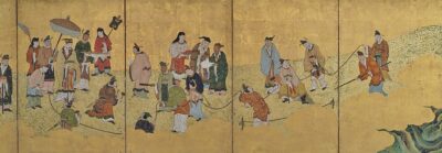 ‘Di jian tu (Illustrated Mirror for Emperors)’ is a set of illustrations depicting the actions of successive Chinese emperors from Yao and Shun through to the Song dynasty, depicting those that should serve as rules for good governance and those that should serve as warnings against evil. The iconography of the ‘Di jian tu’ is based on the ” Di jian tu shuo (Explanation of the illustrated Mirror for Emperors),” compiled by Ming dynasty politician Zhang Juzheng and others. In Japan, six volumes of ‘Di jian tu shuo’ were published by Toyotomi Hideyori in 1606, it became widely known afterwards. Then Di jian tu shuo was taken up as a subject by the Kano school, and was later standardized by Sanraku and Tan’yu and painted on sliding screens.