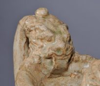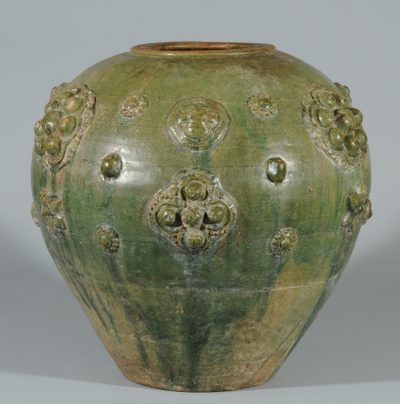 貼花文を持つ緑釉の壺は世界各地に類例があり、かつては北朝から隋のものと考えられましたが、河南省の墓からの出土品が知られるようになったことで、近年では晩唐とされる傾向にあります。一方で、現存する一連の作品には器形・作行き・貼花文の種類にそれぞれ違いがあり、すべてを同時代のものとしてよいかどうか疑問の余地も残します。本作の張りのある形、入念な貼花装飾をご覧いただきどうお感じになるか、壺の制作時について思いを馳せていただくのも楽しみのひとつかと思います。