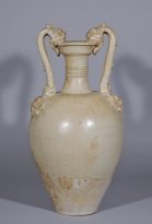 唐時代のやきもので、龍が口部を食む把手を持つ龍耳瓶は世に数多くありますが、本作の盤口を食むのは龍ではなく舌を出す獣です。形式化していない獣の顔の表現、湾曲する把手の逞しさは龍耳瓶と一線を画し、古格が感じられます。